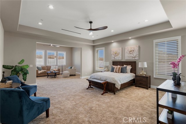 The master suite includes a retreat area, walk-in closets with built-in cabinets, and a luxurious bathroom with a bathtub, dual shower heads, and a rain shower.